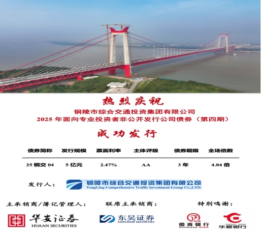 9月15日,市交投集团成功簿记发行2025年第四期面向专业投资者非公开公司债券,额度5亿元,期限3年,票面利率2.47%,全场认购倍数4.04倍。债券票面利率较1年期贷款市场报价利率(LPR)3.0%下降53个BP,综合节约融资成本约795万元。