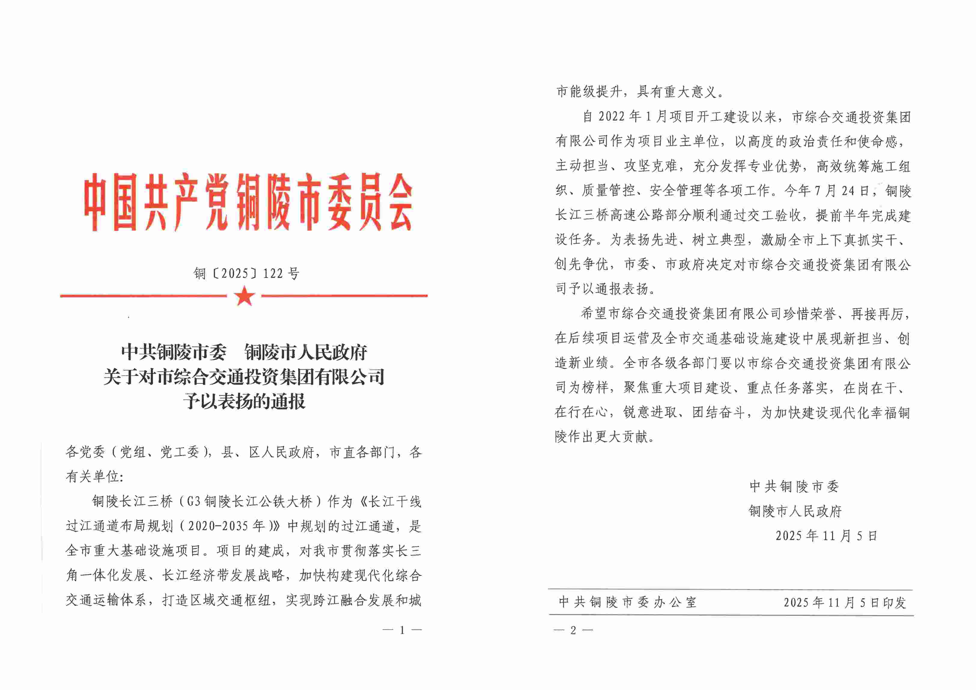 2025年11月6日,由市交投集团投资建设的世界首座公铁两用双层斜拉—悬索协作体系大桥——铜陵长江三桥正式通车运营。市交投集团自大桥2022年1月开工以来,以高度的政治责任感攻坚克难,高效统筹施工组织、质量与安全管理,推动大桥高速公路部分提前半年通过交工验收,获中共铜陵市委、铜陵市人民政府通报表彰。